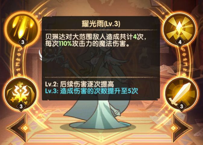 贝琳达释放耀光球,触碰敌人后爆炸,造成210%攻击力的伤害,受伤的敌人命中率下降。这是一个很小范围的群攻小技能,粗看上去也是平平无奇,但一旦贝琳达开启专属武器,只要被施加武器祝福的友军对敌人造成伤害,就会有40%的概率触发一次白送的圣芒,且贝琳达恢复40点能量……