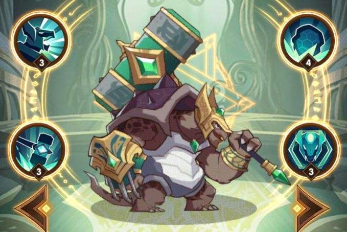入场时自身产生一个50%生命值的护盾,持续8秒,每次释放必杀技时产生一个额外的护盾。这个技能要配合专武,专武会让高尔沃受到的任何护盾都大幅增加数值,不愧是有龟壳的,有厚厚的盾挂在身上非常舒适,能免疫不少控制。