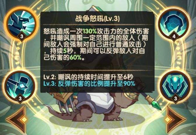 怒吼造成130%攻击力的全体伤害,并嘲讽周围的敌人,期间敌人会强制对高尔沃普攻,持续6秒,期间高尔沃还会反弹60%的伤害。作为一个坦克,这个控型大招还是比较强的,范围不算小,且他自身还会因为不可阻挡技能跳进低人最多的区域,所以收益很大,不过极限越级推关卡时候要小心,被群体普攻围殴也是会死的。