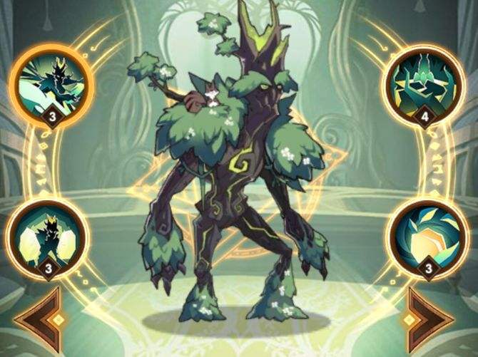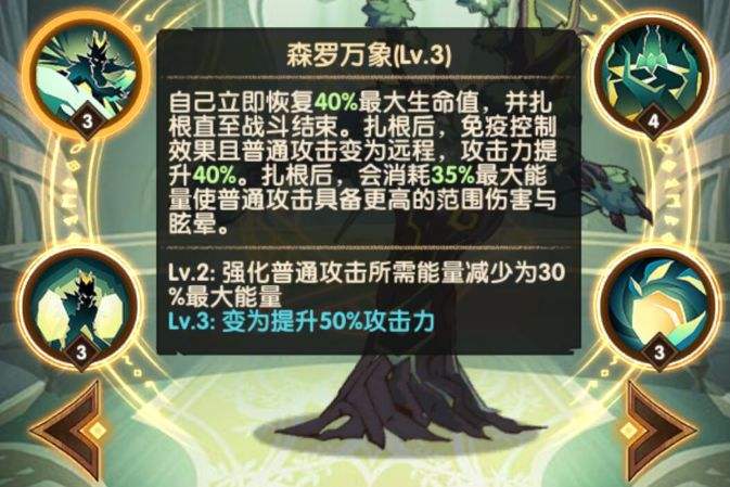立即回复40%最大生命值,扎根直至战斗结束,免疫控制,普攻变为远程,攻击力提升50%,扎根后,再消耗30%最大能量使普攻具备更高的范围和眩晕。大树奥曼斯的核心技能,能不能尽快扎根是使用他的关键,扎根后他就变成控制型炮台,群体伤害加眩晕,攻击频率很高,实测令人难以动弹,作为敌人遇到大树一定要尽快干掉,否则很容易被翻盘。