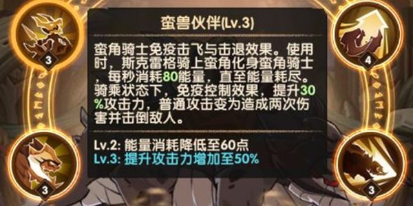 一、‘蛮友伙伴‘蛮角骑士免疫击飞与击退效果。使用时,斯克雷格骑士蛮角化身蛮角骑士,每秒消耗80能量,直到能量耗尽。骑乘状态下,免疫控制效果,提升30%攻击力,普通攻击变为造成两次伤害并且击倒敌人。这个技能保证了蛮角骑士的战斗能力,不会这么容易退缩,一直向前,并且有着强大的范围控制效果和不错的伤害。