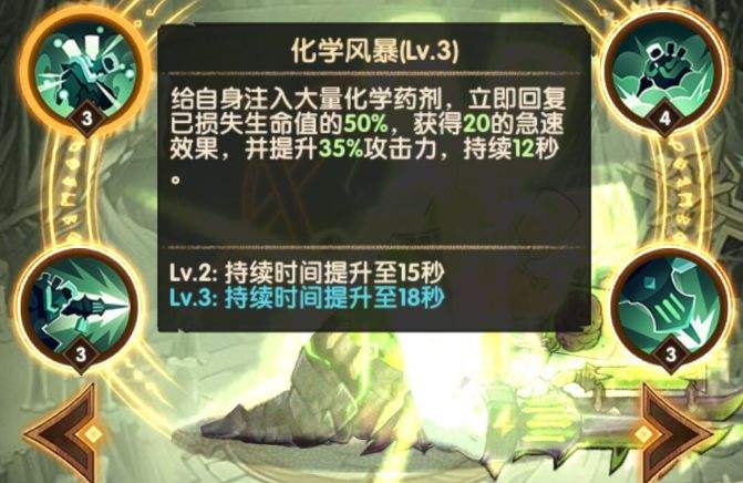 当自身生命高于30%时释放致命酸雾,对周围敌人造成自身每秒3%最大生命值的伤害,对自身每秒造成1%的伤害,每隔6秒引爆一次酸雾,造成340%攻击力的伤害并眩晕敌人3秒。伊索尔德的精髓在于这个伤敌一千自损八百的技能,每6秒的强控和高伤非常吸引人,特别适合与聚怪到身边的英雄打配合。